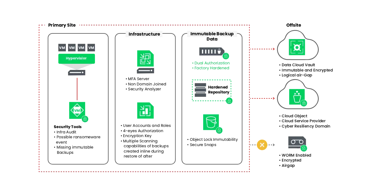 Immutable and air-gapped backup environments protect data from ransomware attacks.